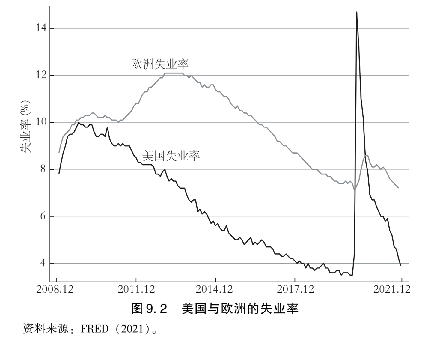 图9.2展示的是美国与欧洲自2008年金融危机以来的失业率变化。美国在新冠疫情中出现了显著的失业率飙升,主要表现为解聘员工和提供慷慨的失业金。欧洲模式则以“短时工作”(Kurzarbeit)制度为核心,这个术语的含义是让员工们即使在不工作时也可保留职位,由政府承担很大部分工资支出,短时工作的工资替代率通常小于100%。哪种政策更为成功将取决于经济活动在疫情之后的长期分布状况。一方面,短时工作制度能维持就业匹配,却不利于劳动力的重新配置,而后者对于疫情这种冲击之后的新岗位的产生是必需的。如果列入短时工作制度的许多岗位在疫情之后没有恢复,欧洲各国将出现众多的隐性失业。另一方面,美国选择的失业策略切断了工作联系,可能导致劳动力市场的严重疤痕效应。