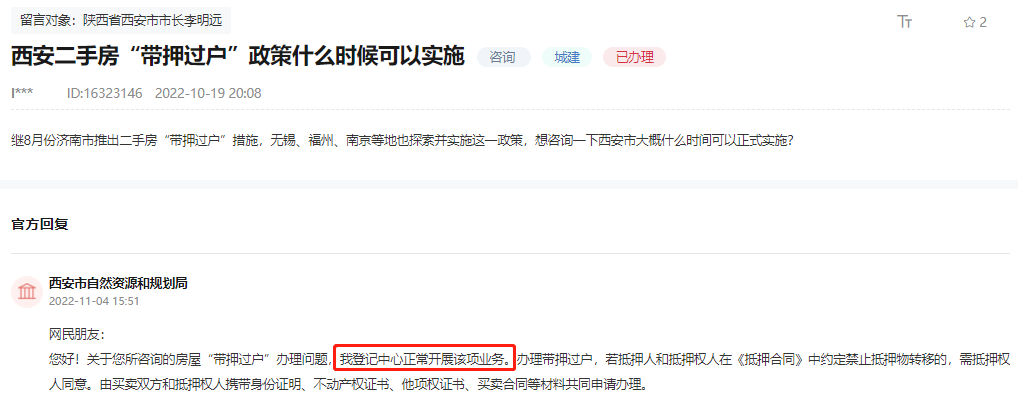 11月4日,西安市自然资源和规划局对网友“关于房屋“带押过户”相关问题进行回复:西安登记中心正常开展该项业务。