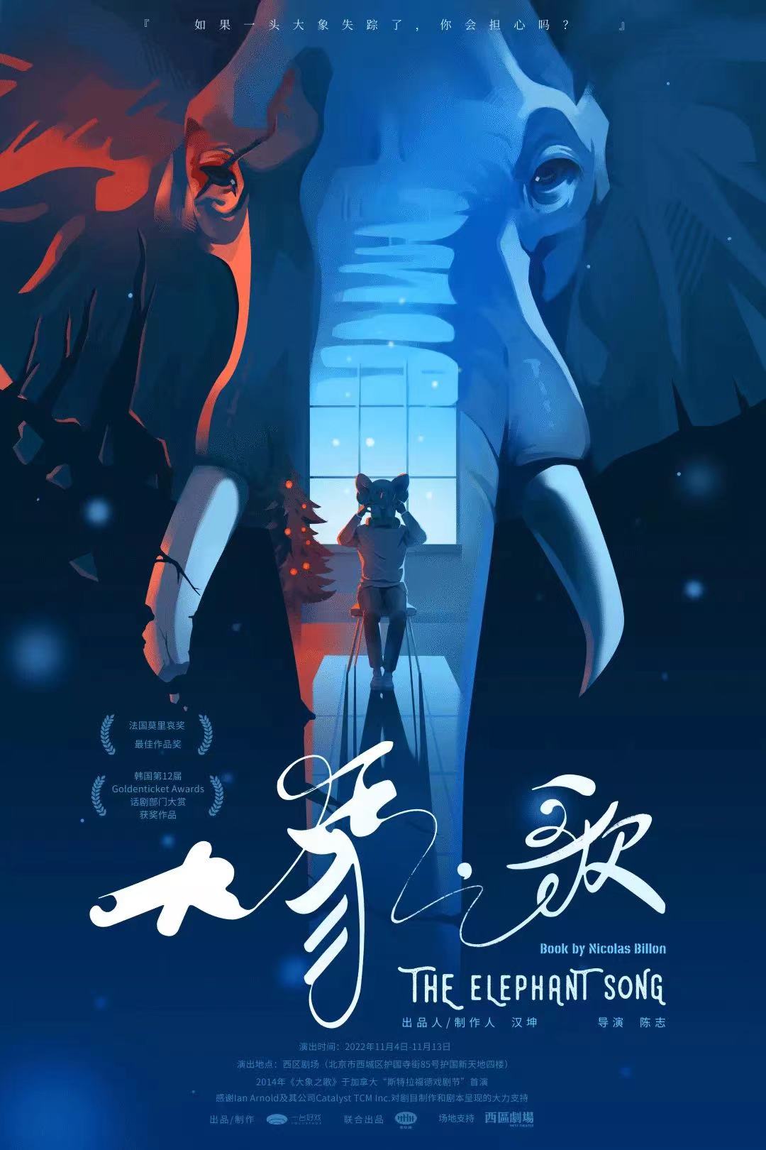 2004年,话剧《大象之歌》原版在加拿大首演,在随后的二十年间,它不仅被制作成多种语言版本,还获得了法国戏剧的“莫里哀奖”最佳作品奖。2022年,中文版《大象之歌》在上海首演并将于11月登陆北京。