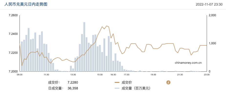 来自中国外汇交易中心的数据显示,2022年11月7日,在岸人民币兑美元夜盘收报7.2280,较上一交易日夜盘收跌353个基点。成交量363.58亿美元,较上一交易日增加25.07亿美元。