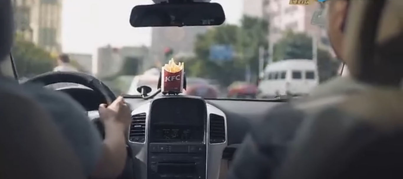 另外广告片中还有一个白色土豆突然像被咬了一口似的少了半圆、驾驶员在车里对着薯条说「嘿,s!带我去最近的 KFC。」等场景,这有意思的巧合让你想起苹果的 LOGO 和善解人意的 Siri 了吗?