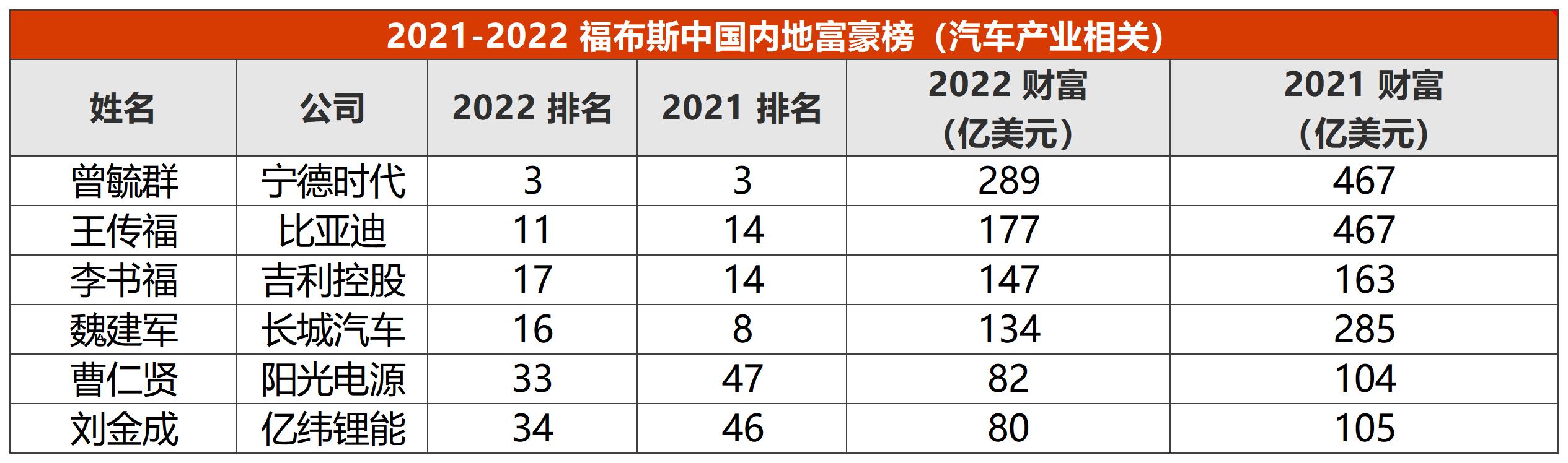11月10日《福布斯》发布2022中国内地富豪榜,国内汽车整车制造公司众,比亚迪创始人王传福、吉利控股集团董事长李书福、长城汽车董事长魏建军均榜上有名。 汽车相关企业阳光电源董事长曹仁贤、亿纬锂能创始人刘金成排名上升,小鹏汽车董事长何小鹏跌出榜单。