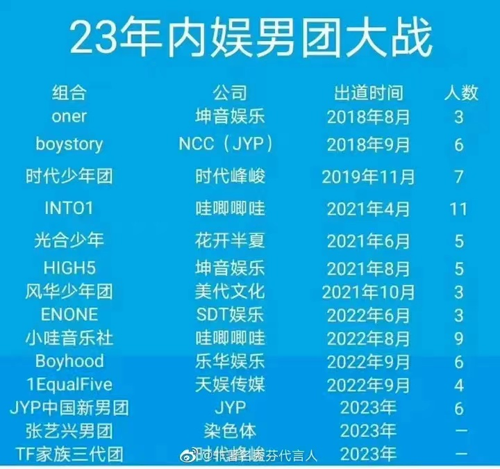 2023年除限定团独苗INTO1外,时代少年团、BOYSTORY、易安音乐社、光合少年、ONER以及威神V等常规偶像团体将开启新的男团大战。2022年11月新浪娱乐联合人民文娱共同打造的娱乐行业生态观察计划《为了我们的荣耀》上线,聚焦25+经纪公司的偶像团体项目,营造舞台生态。当选秀限定团成为历史,内娱偶像市场或许将重新回归到经纪公司的角逐赛。
