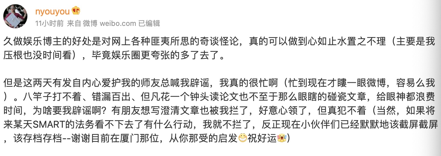 但是这两天有发自内心爱护我的师友总喊我辟谣,我真的很忙啊(忙到现在才瞜一眼微博,容易么我)。八竿子打不着、错漏百出、但凡花一个钟头读论文也不至于那么眼瞎的碰瓷文章,给眼神都浪费时间,为啥要我辟谣啊?有朋友想写澄清文章也被我拦了,好意心领了,但真犯不着(当然,如果将来某天SMART的法务看不下去了有什么行动,我就不拦了,反正现在小伙伴们已经默默地该截屏截屏,该存档存档--谢谢目前在厦门那位,从你那受的启发[坏笑]祝好运[打call])