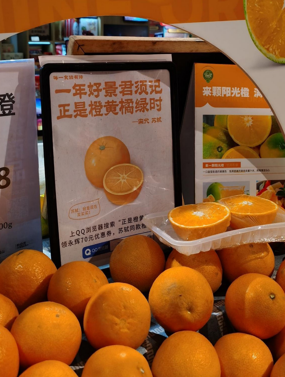 应季水果蔬菜区域里,橙子成了苏轼口中的 “一年好景君须记,最是橙黄橘绿时”;黄瓜是陆游最爱的“白苣黄瓜上市稀,盘中顿觉有光辉。“;胡萝卜则是乾隆同款“可蔬亦可果,宜脆复宜乾。”另外,李白也推销起海鲜 “螃螯即金液,槽丘是蓬莱”,“此行不为鲈鱼鲙,自爱名山入剡中 ”。