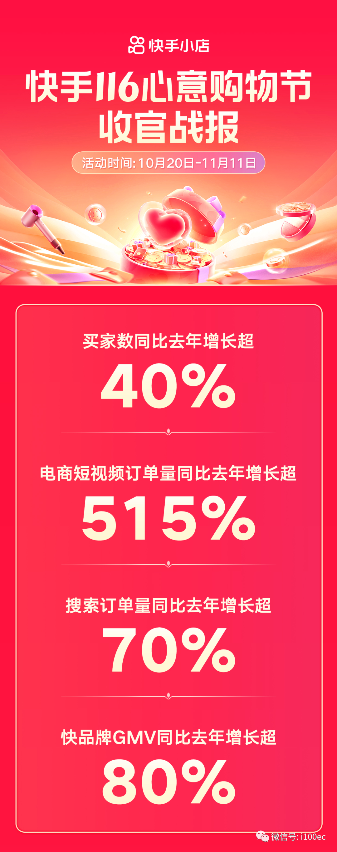 11月12日,快手发布了116心意购物节数据报告。报告显示,今年116期间(10月20日-11月11日),电商短视频订单量增速显著,同比去年增长超515%。买家数同比去年增长超40%,搜索订单量同比去年增长超70%。快品牌表现突出,GMV同比增长超80%。