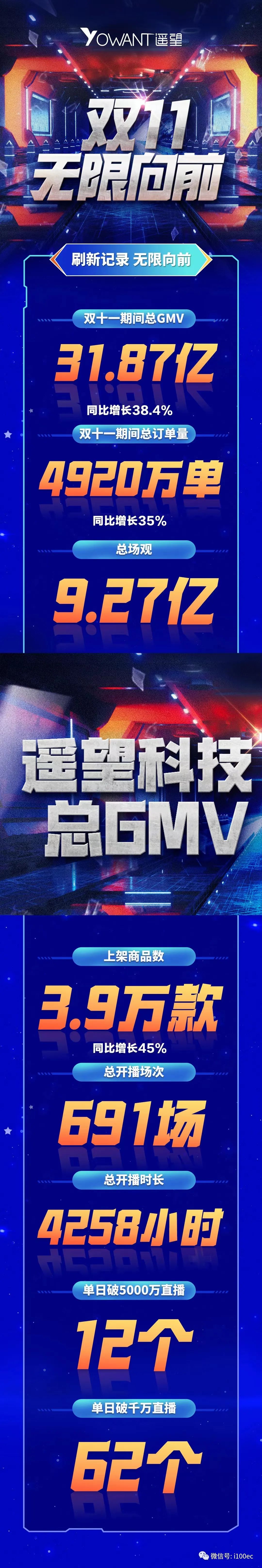 截至2022年11月12日0时0分,遥望总GMV31.87亿元,同比增长38.4%;共产生订单4920万单,总场观达9.27亿。期间共上架商品3.9万款,共开播691场,总开播时长达4258小时。其中,单日破5000万直播12场,单日破千万直播62场;产生GMV破千万商品18个,破500万商品56个,破百万商品403个。