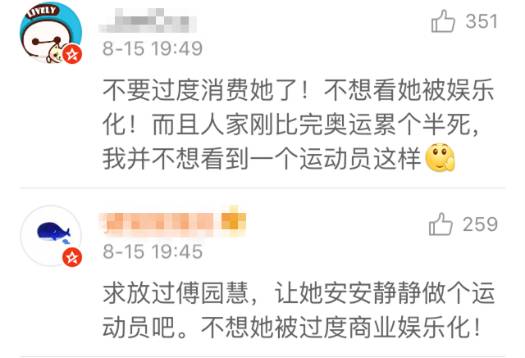 反对派的网友则认为,短时间内参加多档综艺节目,是对这些奥运明星的过度消费。对傅园慧等现役运动员来说,过多的通告可能会影响到日常训练,乃至影响他们的体育生涯。同时,“声色犬马”的娱乐圈,与相对单纯的体育圈大为不同,有不少网友担心这些运动员会迷惑于一时的名利,忘记了在专业上的突破——“上综艺节目的名利来得比艰辛训练快得多,难免会让一些专业的运动员忘了初心。”
