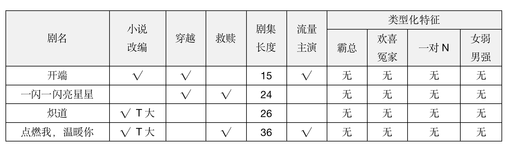 从上表可以看出,这四部剧无法归纳出所谓的爆火公式,它们有的是小说改编,有的是原创;有的是穿越和救赎,有的是日常故事;有的有流量主演,有的是新人小生……但唯一可提炼的共同点是,它们都不具备任何以往影视剧的类型化特征。