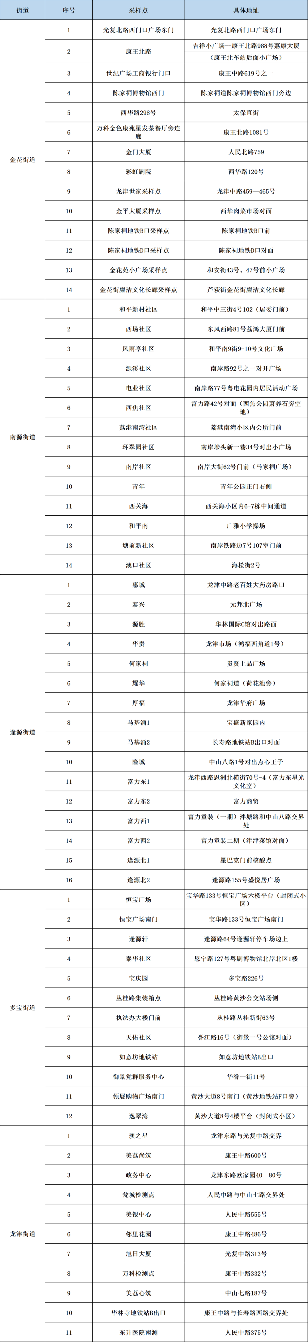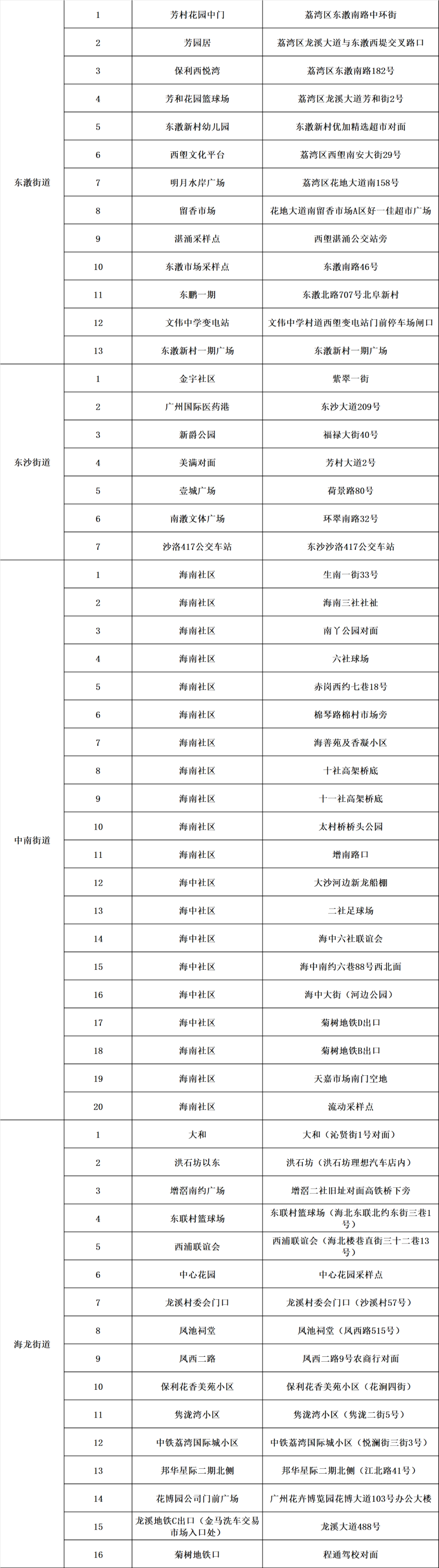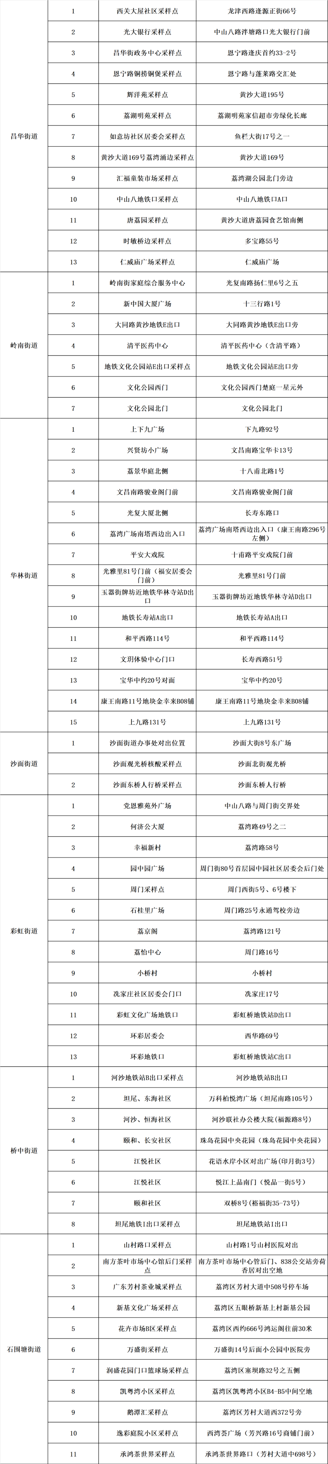 “广州荔湾发布”微信公众号消息,广州市荔湾区新冠肺炎疫情防控指挥部办公室通告,根据最新疫情防控形势,为切实保障广大市民生命安全和身体健康,荔湾区定于2022年11月16日(星期三)开展核酸检测“应检尽检”工作,请荔湾辖区内全体市民(含外来人员)于7时至13时,到就近的采样点(详见附表)进行1次核酸检测。有关注意事项如下: