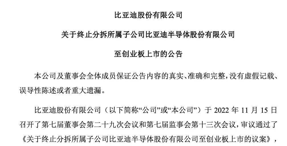 11月15日晚间,比亚迪发布了《关于终止分拆所属子公司比亚迪半导体股份有限公司至创业板上市的公告》。公告称,同意比亚迪半导体终止分拆至深圳证券交易所创业板上市并撤回相关上市申请文件。待条件成熟时,公司将择机再次启动比亚迪半导体分拆上市工作。
