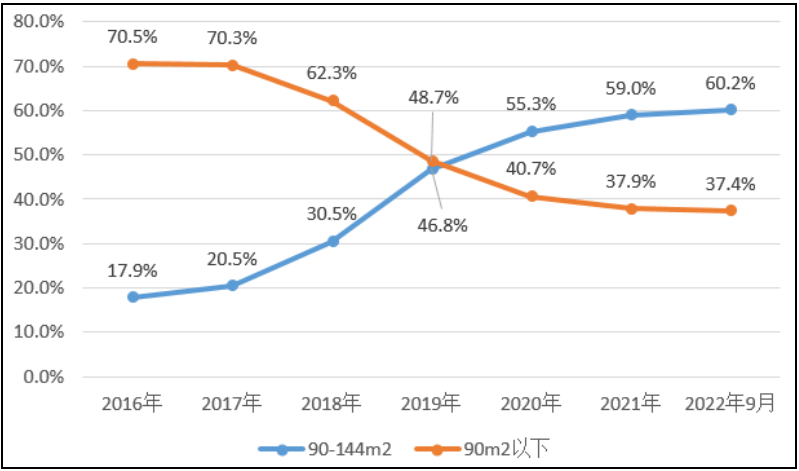 据成交数据显示,2016年,90㎡以下中小户型在新房中的成交占比为70.5%,占比还是挺大的;2018年,这一比例跌至62.3%;2020年,这一比例仅为40.7%,到2022年9月,这一比例下降到37.4%。