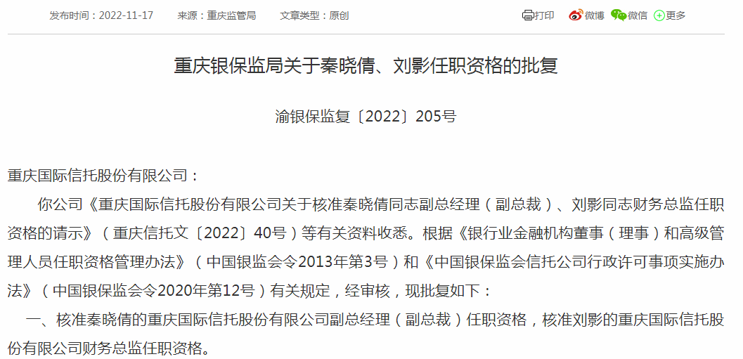 11月17日,重庆银保监局网站发布关于秦晓倩、刘影任职资格的批复。公司《重庆国际信托股份有限公司关于核准秦晓倩同志副总经理(副总裁)、刘影同志财务总监任职资格的请示》(重庆信托文〔2022〕40号)等有关资料收悉。根据《银行业金融机构董事(理事)和高级管理人员任职资格管理办法》(中国银监会令2013年第3号)和《中国银保监会信托公司行政许可事项实施办法》(中国银保监会令2020年第12号)有关规定,经审核,现批复如下: