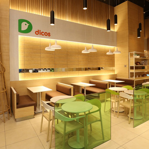 与德克士其他门店相比,这家“舒食+”餐厅采用了森林风格的设计主题,店内主打绿色和原木色的大地色系,柱灯装饰为大树形象,桌椅空间也更加宽敞,在德克士内部被昵称为“森林店”。