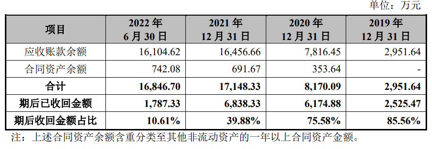 2019年、2020年、2021年和2022年上半年,四方伟业应收账款周转率逐年下滑,分别为4.6倍、3.85倍、2.32倍和0.4倍。公司在2021年签订的合同,目前期后收回率仅为39.88%。