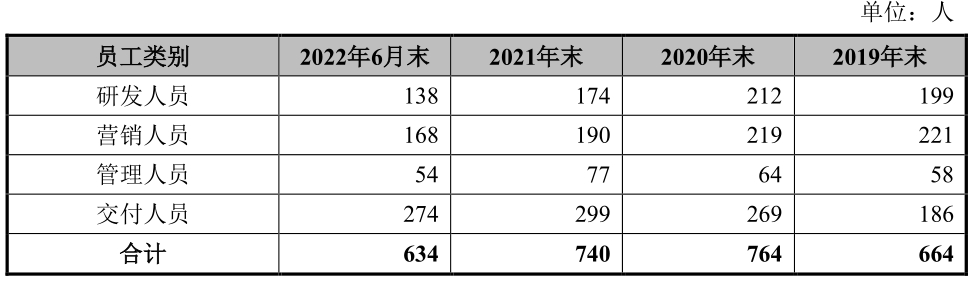 人员方面,四方伟业员工总数从2021年底的740人降至2022年6月末的634人,甚至低于2019年末的水平。在人员结构上,公司研发人员显著减少,2019年末公司研发人员的数量还高于交付人员,到2022年6月末,研发人员数量就只有交付人员的大约一半,公司研发人员比例从2019年末的30%下降至2022年6月末的21.8%,交付人员比例从2019年末的28%提升至2022年6月末的43.2%。