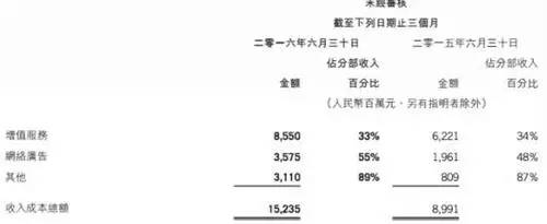 还有一小部分收入来自社交网络,收入同比增长57%至人民币85.56 亿元,主要受虚拟道具销售以及订购服务(尤其是视频、音乐及文学等数字内容服务)收入的增长所推动。
