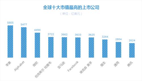 截止6日,全球市值最高的公司为苹果,市值5805亿美元;谷歌母公司Alphabet第2,微软第3,亚马逊第5,Facebook第6。腾讯也成为仅次于这5者的全球科技股第6。