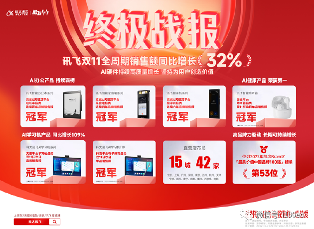科大讯飞公布2022年“双11”战报数据显示,2022年“双11”,科大讯飞销售额同比增长32%。其中,3款AI办公产品连续数年蝉联销售额冠军,AI学习机销售额同比增长109%。