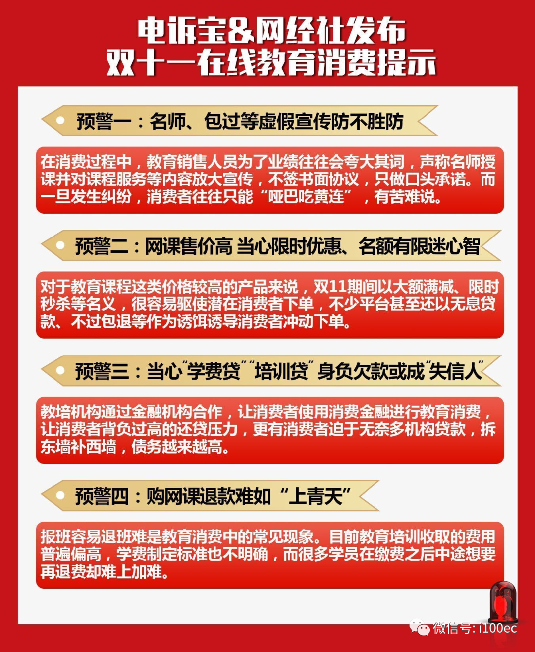 对此,陈礼腾提醒,教育不同于网络购物,教育产品的决策周期长、涉及金额高以及回报周期都较长。在双11各种优惠刺激下,消费者难免冲动消费。价格只能作为消费者参考的第一步,消费者要更为关注平台口碑及教学效果。消费者务必理性分析判断培训机构发布的宣传信息,综合考虑多方面因素,可申请先体验一下培训课程,切勿冲动报名。