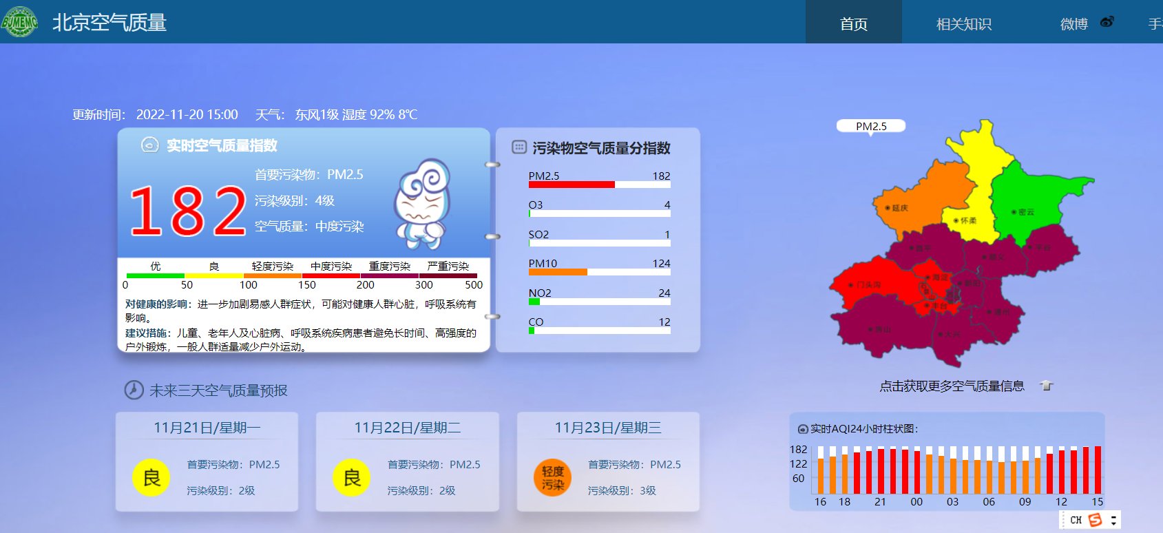 据北京市生态环境监测中心,截至11月20日15时,北京实时空气质量指数为182,处于中度污染水平,首要污染物为PM2.5,污染级别为4级。其中,东城、西城、朝阳、大兴、通州、房山、昌平、顺义、平谷等区已达到重度污染水平。