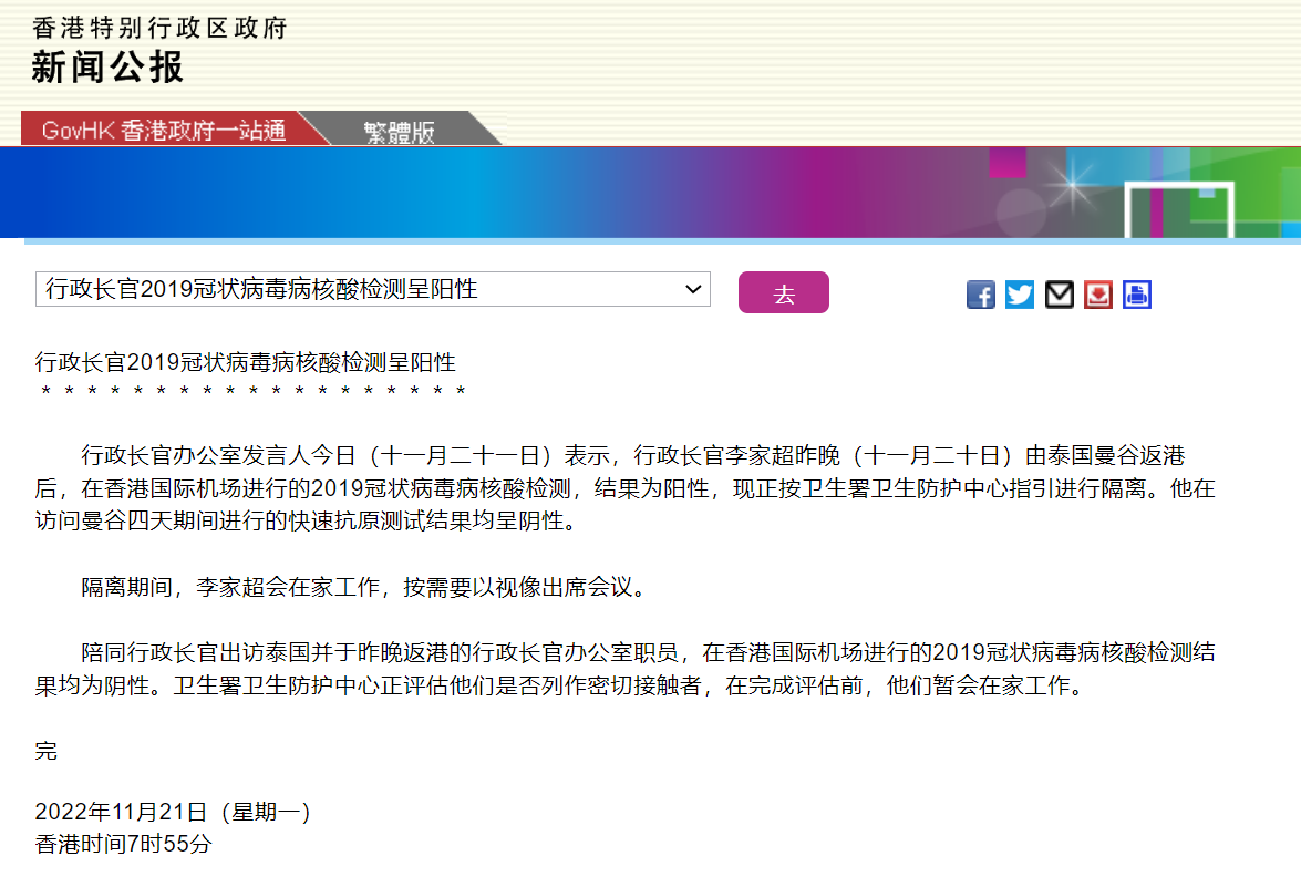 香港特区政府网11月21日发布新闻公报显示,香港特区行政长官李家超11月20日由泰国曼谷返港后,在香港国际机场进行的新冠病毒核酸检测,结果为阳性,现正按卫生署卫生防护中心指引进行隔离。他在访问曼谷四天期间进行的快速抗原测试结果均呈阴性。