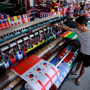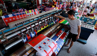据义乌体育用品协会估算,从世界杯32强的旗帜到喇叭、哨子,从足球到球衣、围巾、大力神杯的摆件和抱枕,“义乌制造”几乎占到整个世界杯周边商品市场份额的70%。