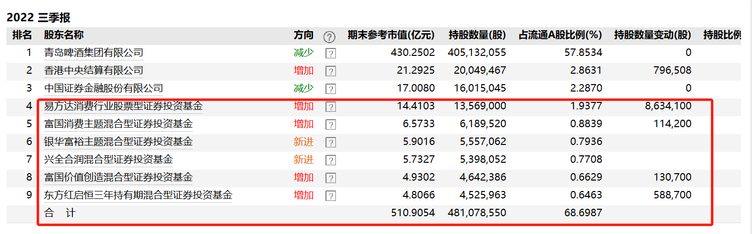 青岛啤酒的前十大流通股东中,不乏知名基金经理的身影。其中,由萧楠、王元春共同管理的易方达消费行业在三季度加仓了863.41万股,成为持股数量最多的公募基金;王园园管理的富国消费主题,三季度加仓了11.42万股。