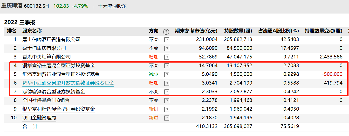 而重庆啤酒的前十大流通股东中,也出现了焦巍、胡昕炜等基金经理的身影。银华富裕主题在三季度末仍持有1310.73万股,没有加减仓,位列第四大重仓股;焦巍管理的另一只银华富利,截至三季度末仍持有196万股。而胡昕炜管理的汇添富消费主题,则减持了50万股,截至三季度末仍持有450万股。