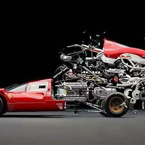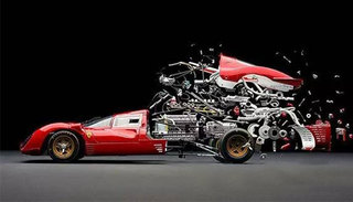 那这些作品是怎么做的呢?Fabian先将脑海中的布局画出来,然后将车模拆掉,用线将每一个零部件悬吊起来并单独拍摄,最后将所有照片P在一起。对Fabian来说,他更享受拆分零部件的过程,高达上千个的零部件意味着要单独拍上千张的照片,没有真正的热情是无法坚持下来的。法拉利残骸咖啡桌
