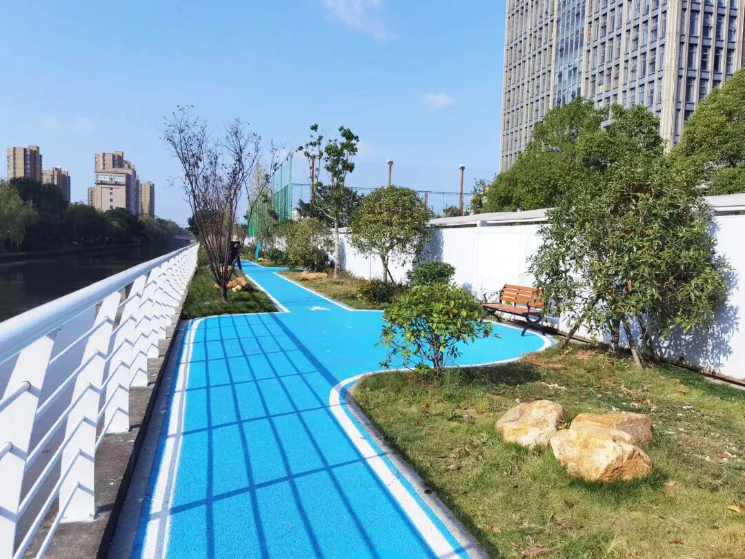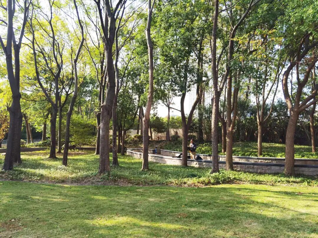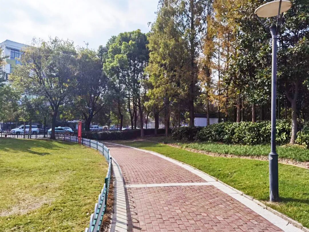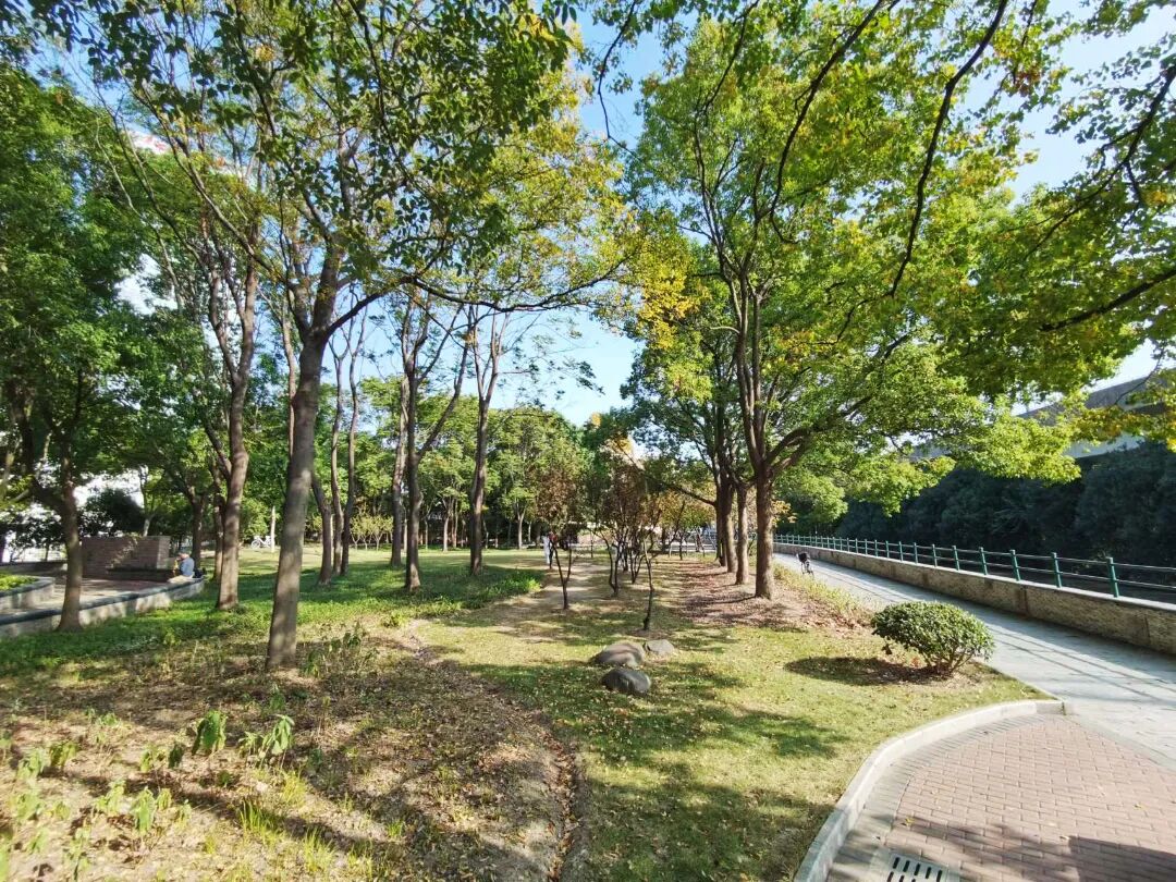 在逸仙路西北侧,沿着长逸路一路向西,不久就能看到一片绿地——郝桥港绿地。作为一个口袋公园,郝桥港绿地占地3000平方米,由小花园改建而成,绿地保留了原有树木,新增了草坪、地被植物和花卉等十多种植物。公园里设有小广场和步道,平日里不仅有不少居民来这里散步休息,还有居民常来吹奏乐器、打太极拳,是一处很受欢迎的绿色休闲空间。绿地的北面是南泗塘河和沿河步道,清新的蓝色调令人眼前一亮,漫步其间,仿佛与城市隔绝的安静氛围让心灵也得到了片刻的休息和放松。