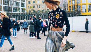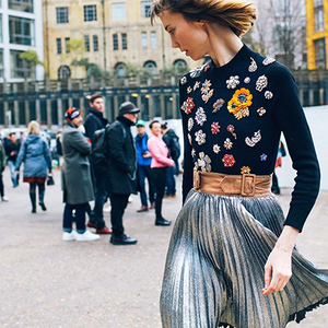 说到最合适这个季节的单品,百褶裙肯定会是其中之一。或许我们要感谢Alessandro Michele,他一声不吭的神来之笔,将百褶裙从朴素文静的格调变成发着光的似乎有些代表叛逆的金属色。正如他本人所说的,这样的裙褶,具有一种身体内的律动。起伏有致,那百褶裙在秀场上随着脚步上下摆动,像是带着骄傲的感觉“你就说我亮不亮吧?”