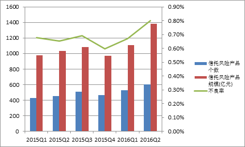 不难看出,近6个季度以来,风险资产金额绝对数以及风险项目个数总体上均呈现出增长的趋势,同样这一点也能从不良率的数据中看出,虽然2015年四季度不良率有所下降,但是2016年一、二季度末不良率再现抬头的趋势,2016年2季度末不良率达到了0.8%,超出2015年最高水平0.11%,当然这也与信托业整体规模增长有关。
