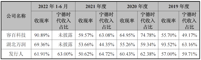 壹连科技表示,同为宁德时代供应商且宁德时代收入占比较高的容百科技和湖北万润,其收现率与公司差别不大。
