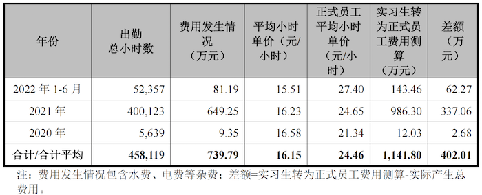 据问询函的回复,壹连科技学生来源为河池市技工学校、桂林技师学院、于都科技学院、安徽池州中等职业学校等职业学校学生,用工岗位为总装员/检验员,工费的单价为16.15元/小时,而使用正式员工的平均工费为24.46元/小时。