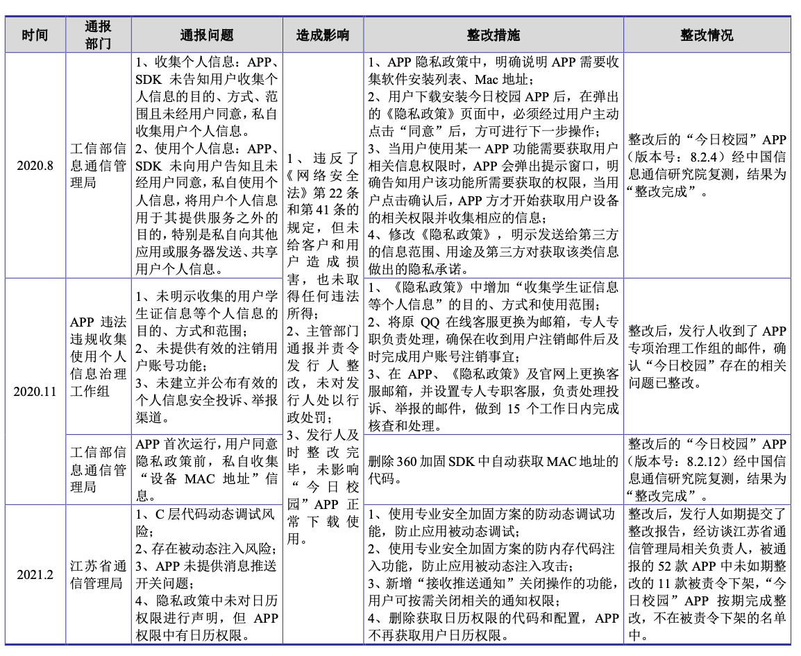 公开资料显示,金智教育因“今日校园”APP 收集和使用个人信息收到相关部门通知、通告或通报(以下合称“通报”),分别为2020年8月收到工信部信息通信管理局通报;2020年11月收到APP违法违规收集使用个人信息治理工作组、工信部信息通信管理局通报;2021年2月收到江苏省通信管理局通报。