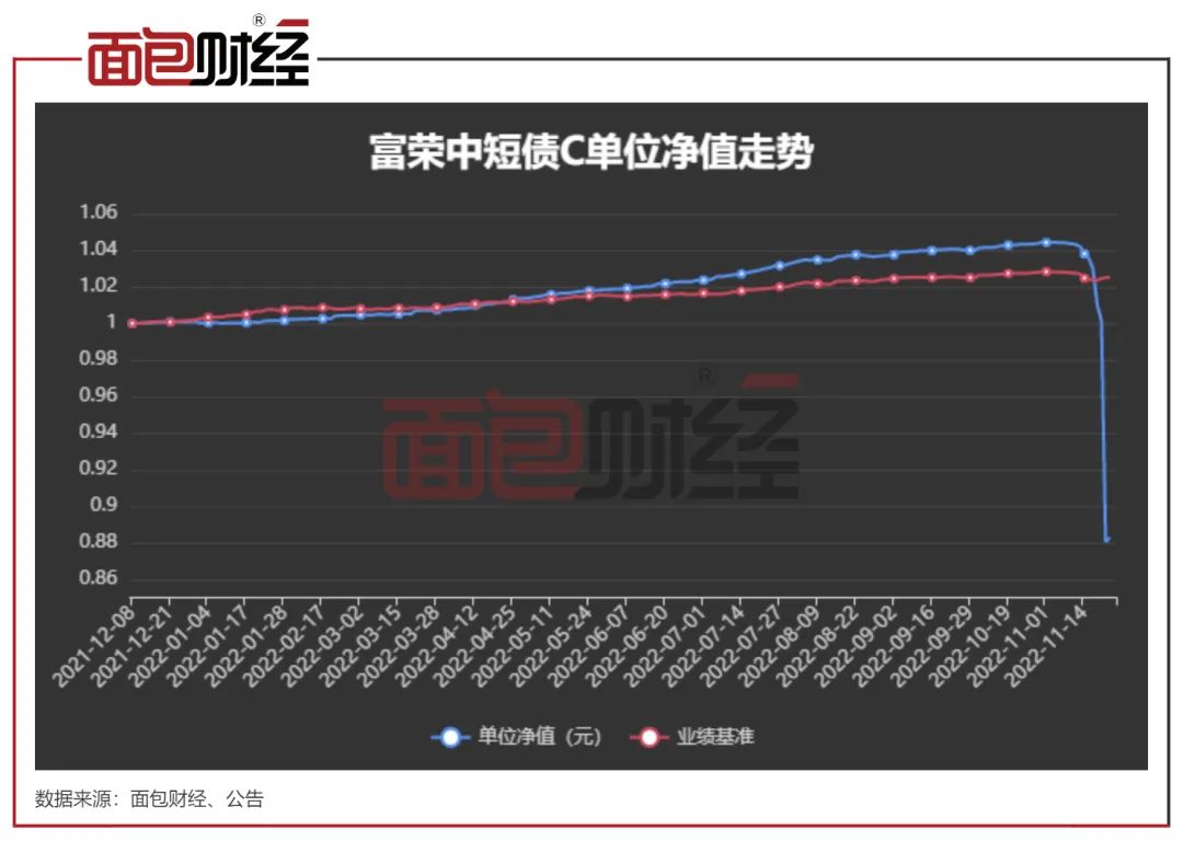 截至2022年11月22日,富荣中短债C的单位净值为0.8827元,近一周净值跌幅达14.77%,其中11月21日单日跌幅达到12.08%。债券型基金在短期内出现如此大的回撤的情况相对少见。