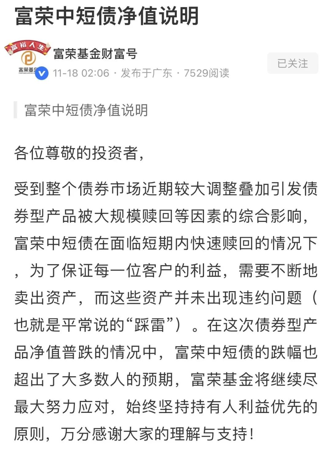 自11月上旬,富国中短债的A、C类份额的单位净值接连出现下滑,11月17日单日跌幅达到1.89%。随后,富国基金在第三方平台发表说明,称“富荣中短债在面临短期内快速赎回的情况下,为了保证每一位客户的利益,需要不断地卖出资产,而这些资产并未出现违约问题”。