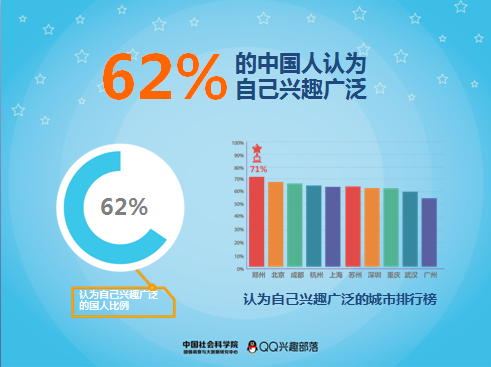 62%的中国人认为自己兴趣广泛,音乐、运动、阅读是最受欢迎的“全民兴趣”。其中,郑州、北京、成都,位列兴趣广泛城市的前三名,上海、深圳、广州分别位于第五、第七和第十的位子。有意思的是,兴趣广泛的程度,和城市的发达程度并非是绝对的正相关。