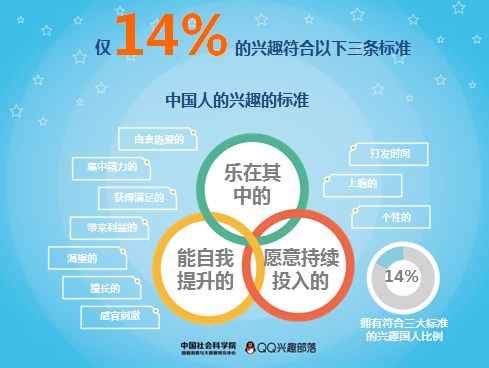 然而根据调研,如果按照用户认为的“真正的兴趣”需符合“乐在其中的”、“能提升自我的”、“愿意持续投入的”三大标准,那么受调研用户中仅有14%的人拥有符合标准的“兴趣”。