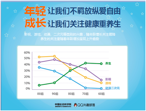 国人的兴趣分布主要在兴趣因年龄的不同,有着显著区别。年纪越长越注重养生,年纪越小越喜欢影视、游戏、动漫、二次元等娱乐类的兴趣。90、00后最关注明星和游戏,而60、70、80后则更关注情感类话题。