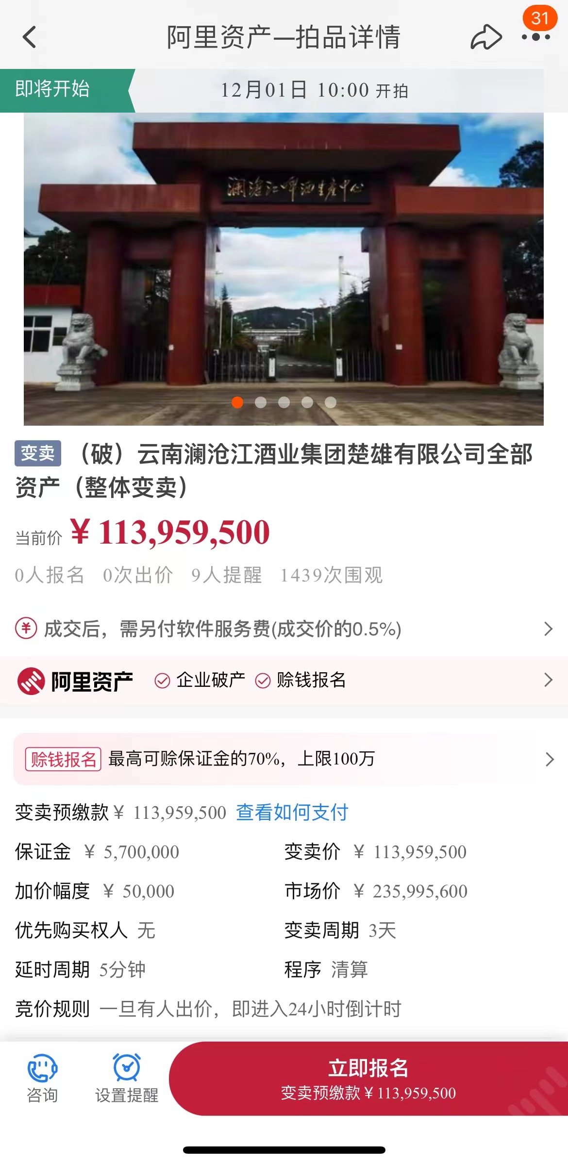 11月24日,界面新闻登录阿里资产平台发现,云南澜沧江酒业集团楚雄有限公司(以下简称“澜沧江酒业楚雄公司”)因破产导致全部资产变卖底价为1.14亿元,标的市场价为2.36亿元。