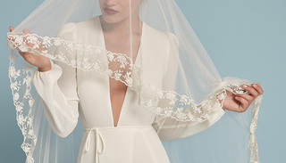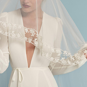 头纱似乎是每个姑娘的心头好,但它不需要太夸张,薄薄地一层,周围用蕾丝镶嵌着白色的花朵。一样是deep v的款式和高开衩的裙摆,高腰的设计使得比例更趋完美。