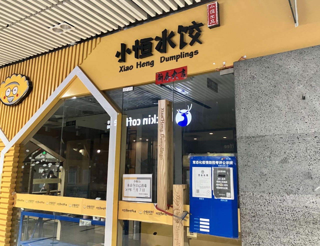 今年10月,界面新闻走访小恒水饺位于北京万科中心、十里河等在点评网站可以查询到店铺,发现上述两家店铺均已关闭,南三环首经贸店则刚刚关闭,上了锁的玻璃门内仍能看到餐桌椅、取擦吧台以及小恒水饺黄色系的营销装饰。