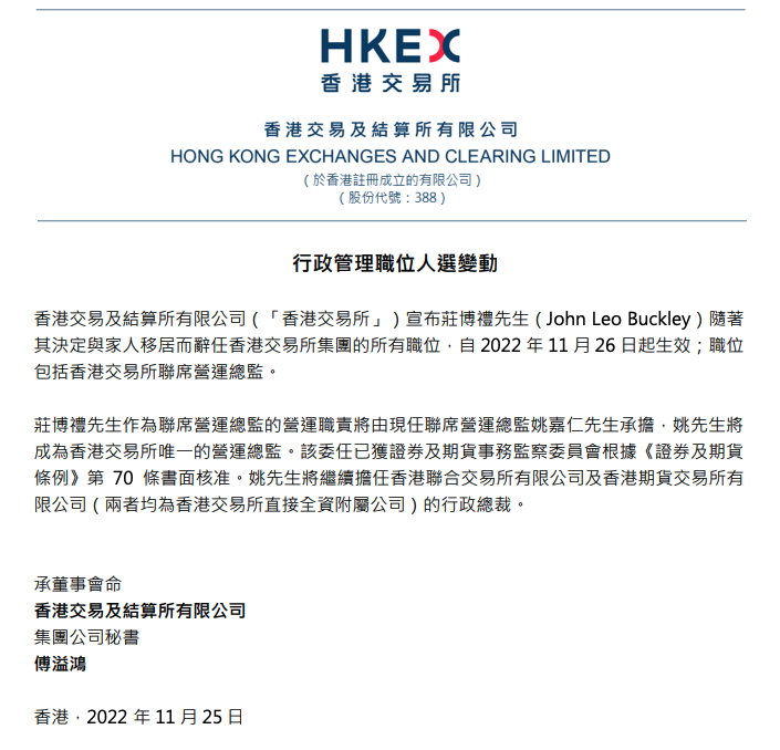香港交易所11月25日午间宣布,庄博礼(John Leo Buckley)随着其决定与家人移居而辞任香港交易所集团的所有职位,自2022年11月26日起生效;职位包括香港交易所联席营运总监。