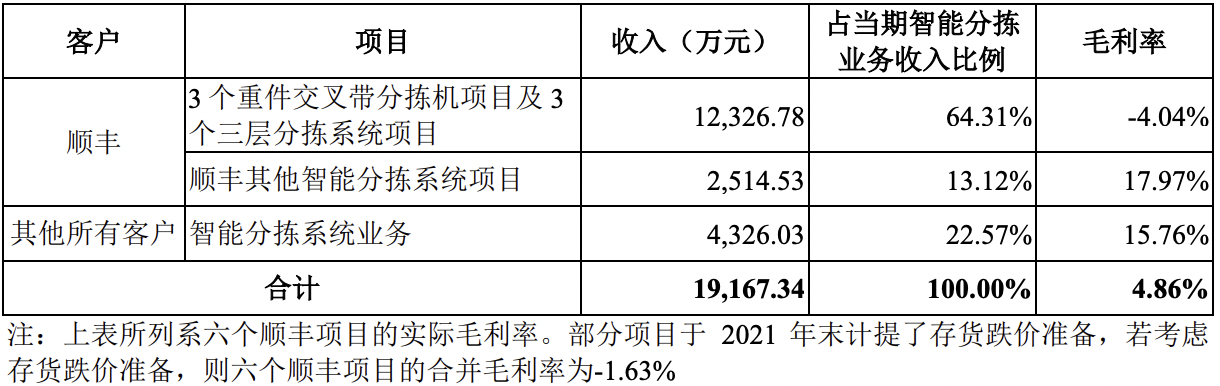 招股书显示,这主要由于顺丰作为国内头部快递公司之一,2021年起持续加大物流系统自动化、智能化投入,对相关智能物流系统的采购需求大幅增加。
