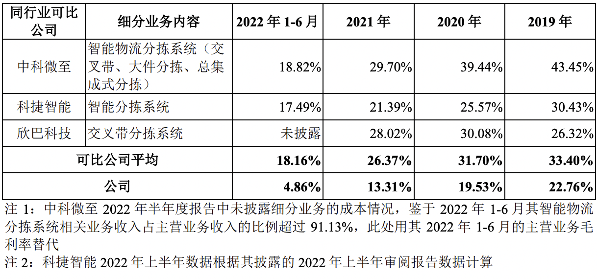 在可比公司中,中科微至(688211.SH)、科捷智能(688455.SH)、欣巴科技(300745.SZ)均从事智能物流系统业务,2022年可比公司平均毛利率为18.16%,2019年-2021年分别为33.4%、31.70%、26.37%。