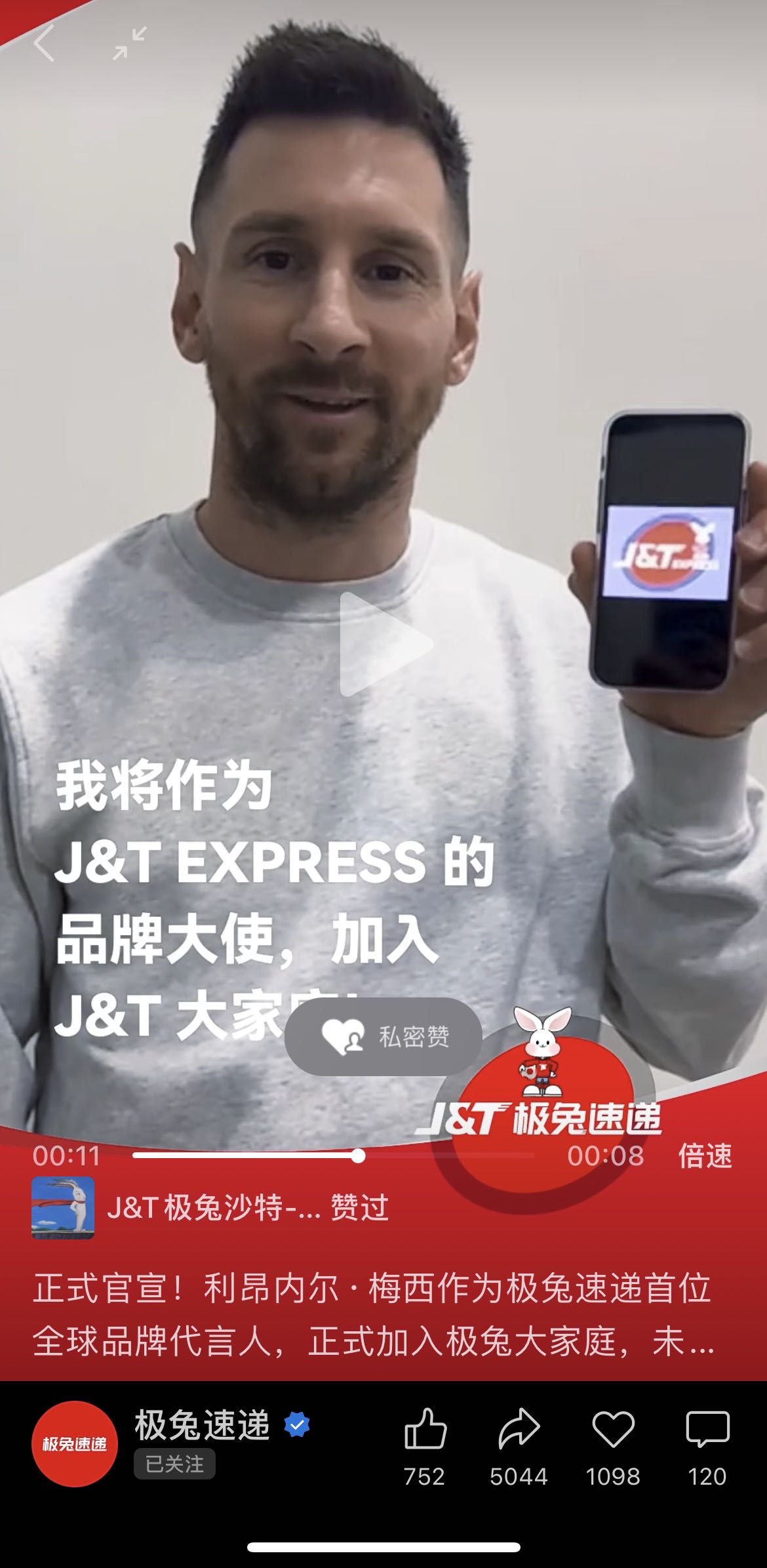 为此,梅西本人录制了一则短视频,称自己将成为极兔速递的品牌大使,“接下来,我们将携手并进,为大家传递更多惊喜。”梅西在视频中说。