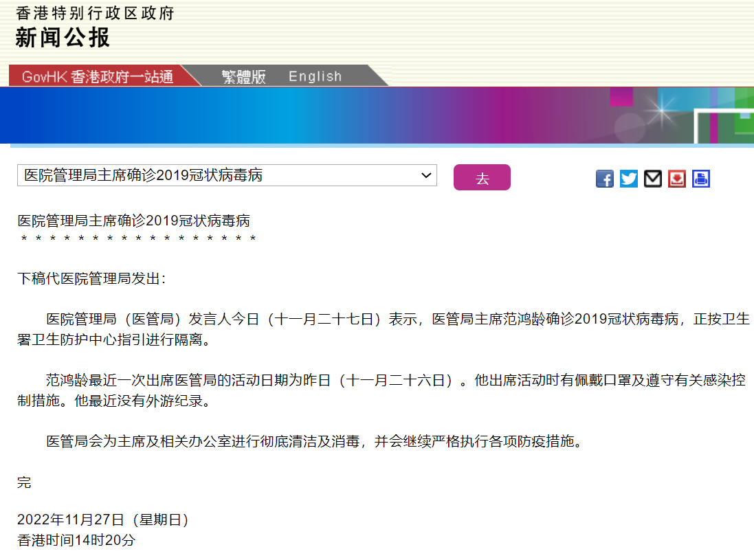 11月27日,香港特区政府网发布新闻公报显示,香港医院管理局主席范鸿龄确诊感染新冠病毒,正按卫生署卫生防护中心指引进行隔离。