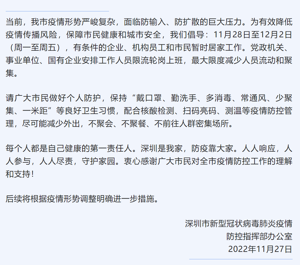 “深圳发布”微信公众号消息,当前,深圳市疫情形势严峻复杂,面临防输入、防扩散的巨大压力。为有效降低疫情传播风险,保障市民健康和城市安全,我们倡导:11月28日至12月2日(周一至周五),有条件的企业、机构员工和市民暂时居家工作。党政机关、事业单位、国有企业安排工作人员限流轮岗上班,最大限度减少人员流动和聚集。